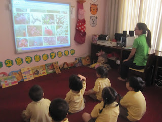 " Hoa đào có màu gì nhỉ?"Các bạn nhỏ biết rấr rõ và nói to cho cô biết :"Thưa cô màu hồng"